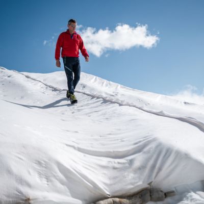 Glaciers are covered with a special non-woven geotextile made from TENCEL™ fibers. This natural material protects the ice from solar rays and drastically slows melting, without contaminating the environment with fossil-based microplastics.